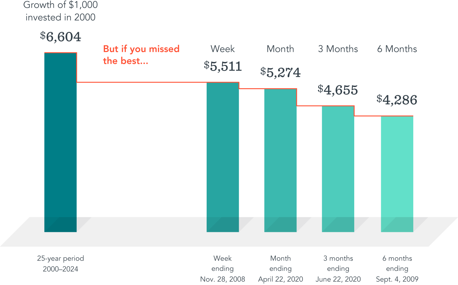 For example, the chart below shows a hypothetical investment in the Russell 3000 Index, a broad US stock market benchmark. Over the entire 25-year period ending December 31, 2024, a $1,000 investment in 2000 turned into $6,604. But what if you pulled your cash out at the wrong time? Missing the best week, month, three months, or six months would have significantly reduced the growth of your investment.