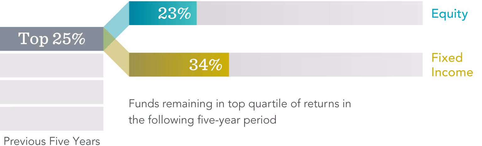 You might be inclined to select investments based on past returns, expecting top-ranked funds to continue delivering the best performance. But can they maintain that outperformance? Research shows that most funds ranked in the top 25% based on five-year returns didn’t remain in the top 25% in the next five years. In fact, only about one in five equity funds stayed in the top-performing group, and only about a third of fixed income funds did. The lesson? A fund’s past performance offers limited insight into its future returns.