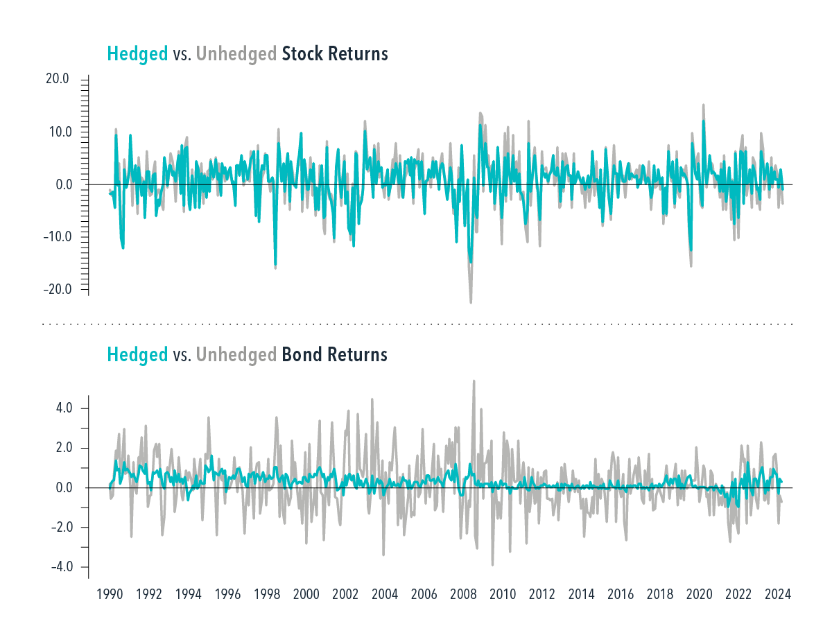 A common question is whether to hedge this currency exposure. The answer may depend on the asset class and the investor’s goals. In the case of equities, volatility tends to be driven more by stock price swings than currency movements, so hedged and unhedged global equity portfolios have shown similar volatility over time.